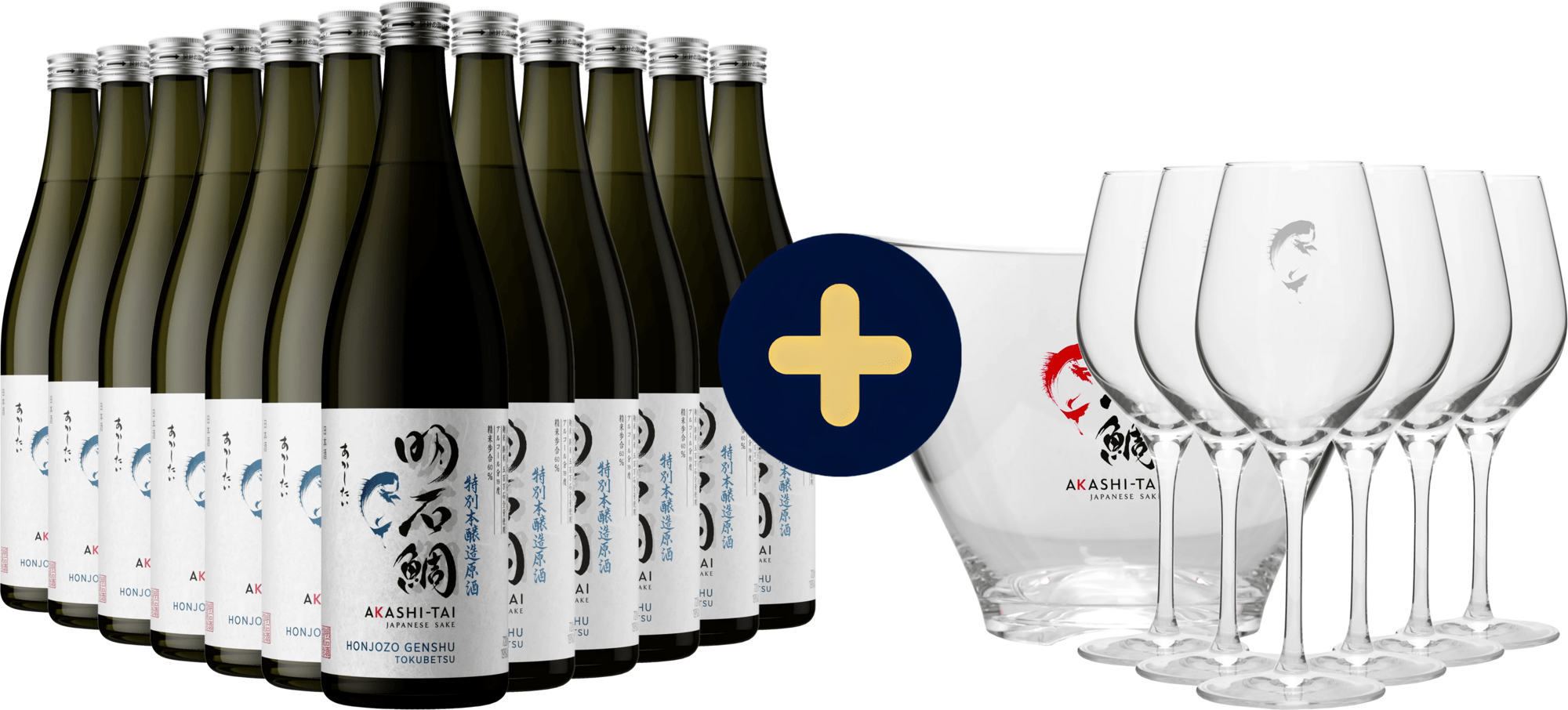 Bundle 12× Akashi-Tai Honjozo Genshu Sake + 6 glasses and a cooler for free