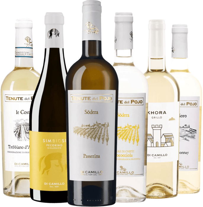 Di Camillo Tenute del Pojo Trebianno d'Abruzzo is a fresh young Italian white wine. Made from 100% Trebbiano d'Abruzzo (also known as ugni blanc) grapes grown on clay-limestone soil in the Chieti wine region, Trebiano d'Abruzzo D.O.P., Italy. After both mechanical and manual harvesting, this popular grape variety is first gently pressed in the vinification process and then fermented at a controlled temperature. The result is a straw yellow wine with a fresh, fruity and delicate bouquet.