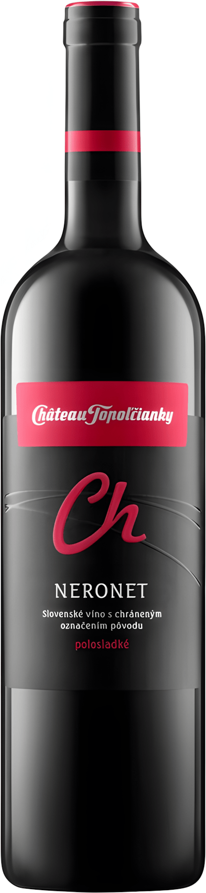 Red, semi-sweet wine of the Neronet variety from the South Slovak wine-growing region, winery Chateau Topoľčianky. A rather complicated cross of the varieties (Svätovavrinecké x Modrý Portugal) x Alibernet.