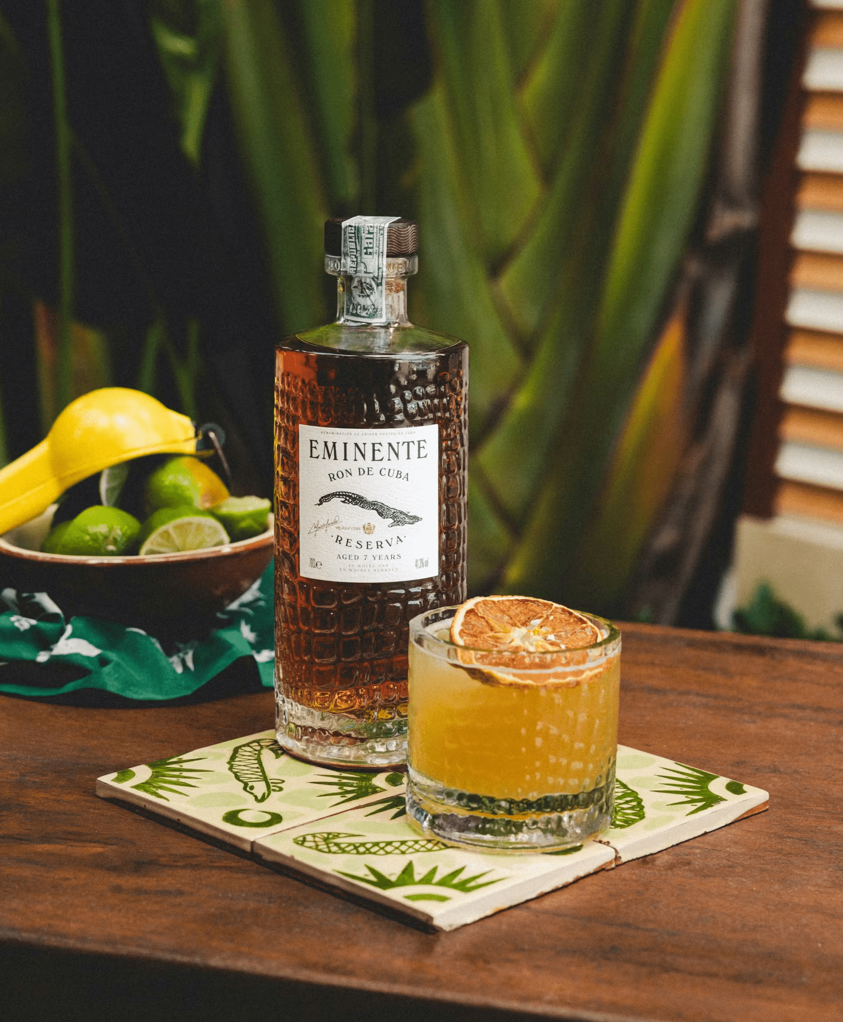 Elegant Cuban rum Eminente Reserva, which is made from 100% local sugar cane. It has a complex and deep taste with fantastic fresh notes of flowers, spices, chocolate and smoke.
