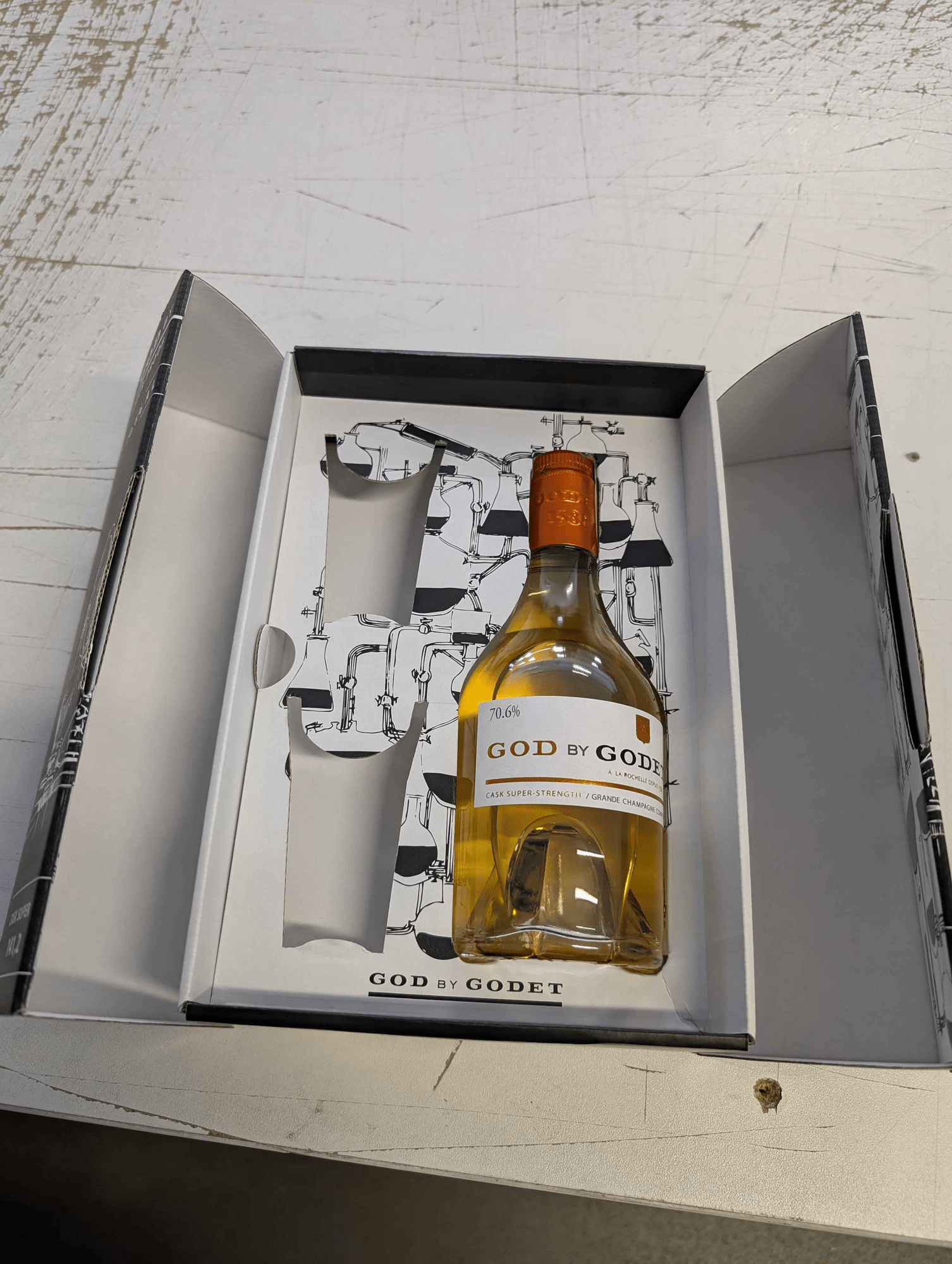 God by Godet VSOP is the strongest cognac ever produced by the Godet brand. This excellent overproof cognac was bottled at cask strength of 70.6% alcohol content. It is cognac in its natural "raw" form. After distillation, it aged in a single French oak cask, without any exposure to sunlight, without blending with other cognacs, and without softening with water. It contains no added caramel or sugar.