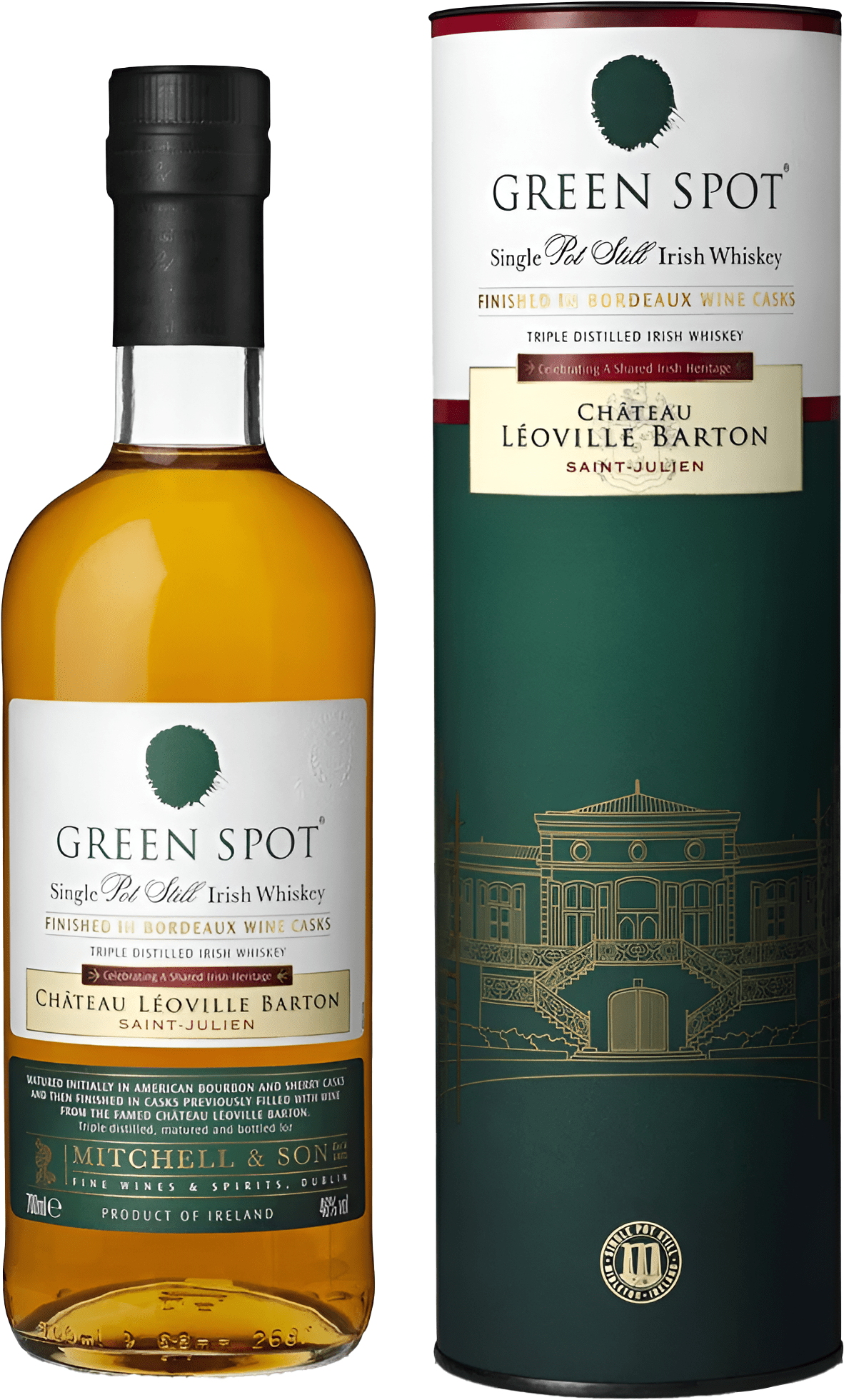 Green Spot whiskey is first aged in a combination of ex-Sherry Oloroso casks, fresh American oak barrels and ex-bourbon casks. Finally, it is finished and aged in Château Léoville Barton Bordeaux wine casks for 12 to 24 months.
