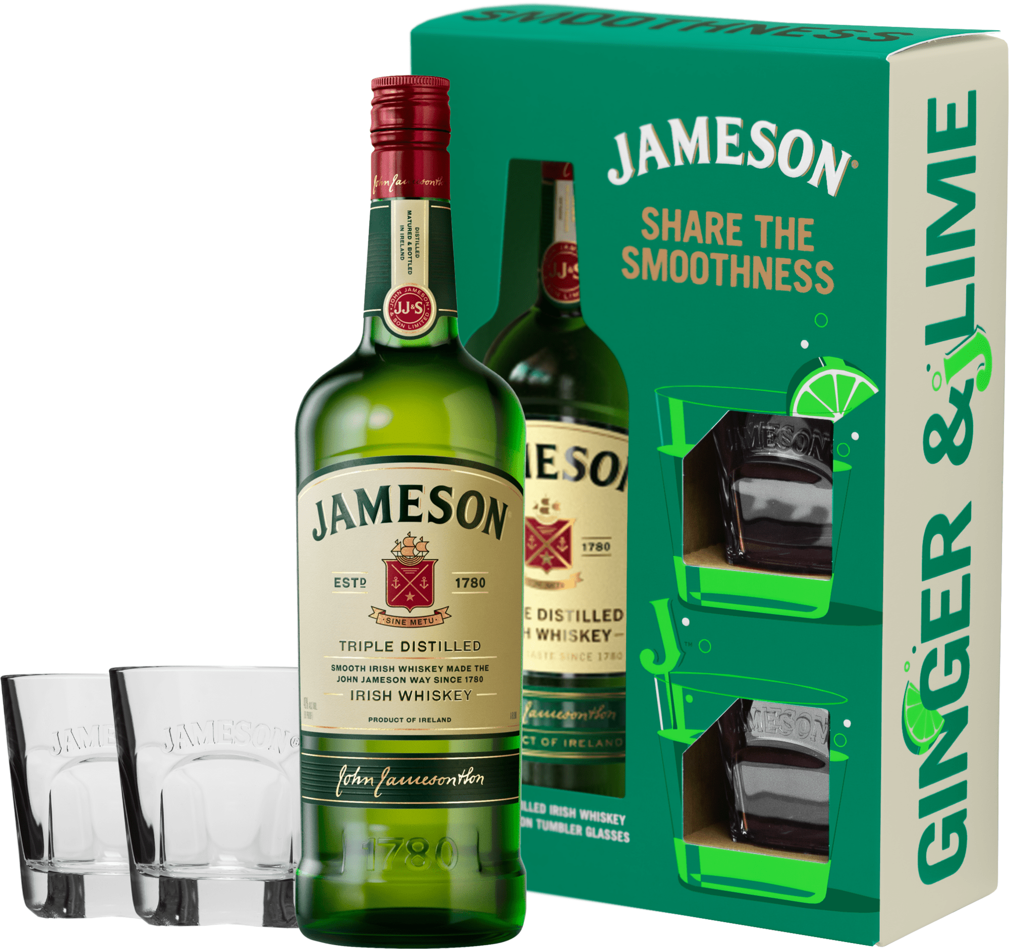 Excellent Irish blended Jameson whiskey, which undergoes triple distillation and matures for at least 4 years in oak barrels. Bottle with a volume of 0.7 l and two stylish glasses in a gift box.