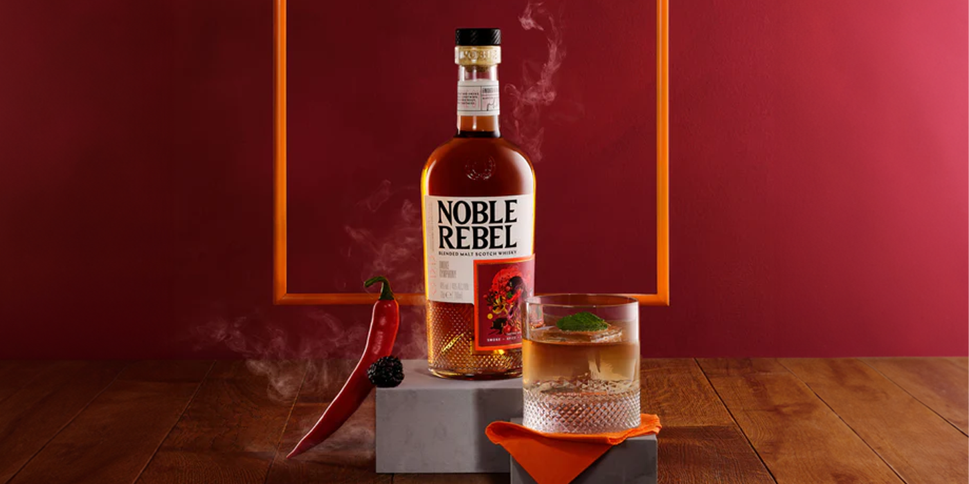 Peated blended malt whisky Noble Rebel Smoke Symphony is a blend of different whiskies, all of which have been matured in hand-selected oak casks for a minimum of 3 years. They are then expertly blended to create a modern blended malt whisky that pushes the boundaries of whisky making. Full of peat and spicy chilli notes, the blend is finished in Rioja red wine casks that add layers of tart and rich dark berry fruit to its smoky heart.